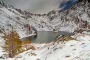 Le lac de Trécolpas enneigé | 1/100 s à f/11 - 100 ISO - 21 mm | 18/10/2010 - 13:51 | 44°6'60" N 7°20'22" E | 2167 m